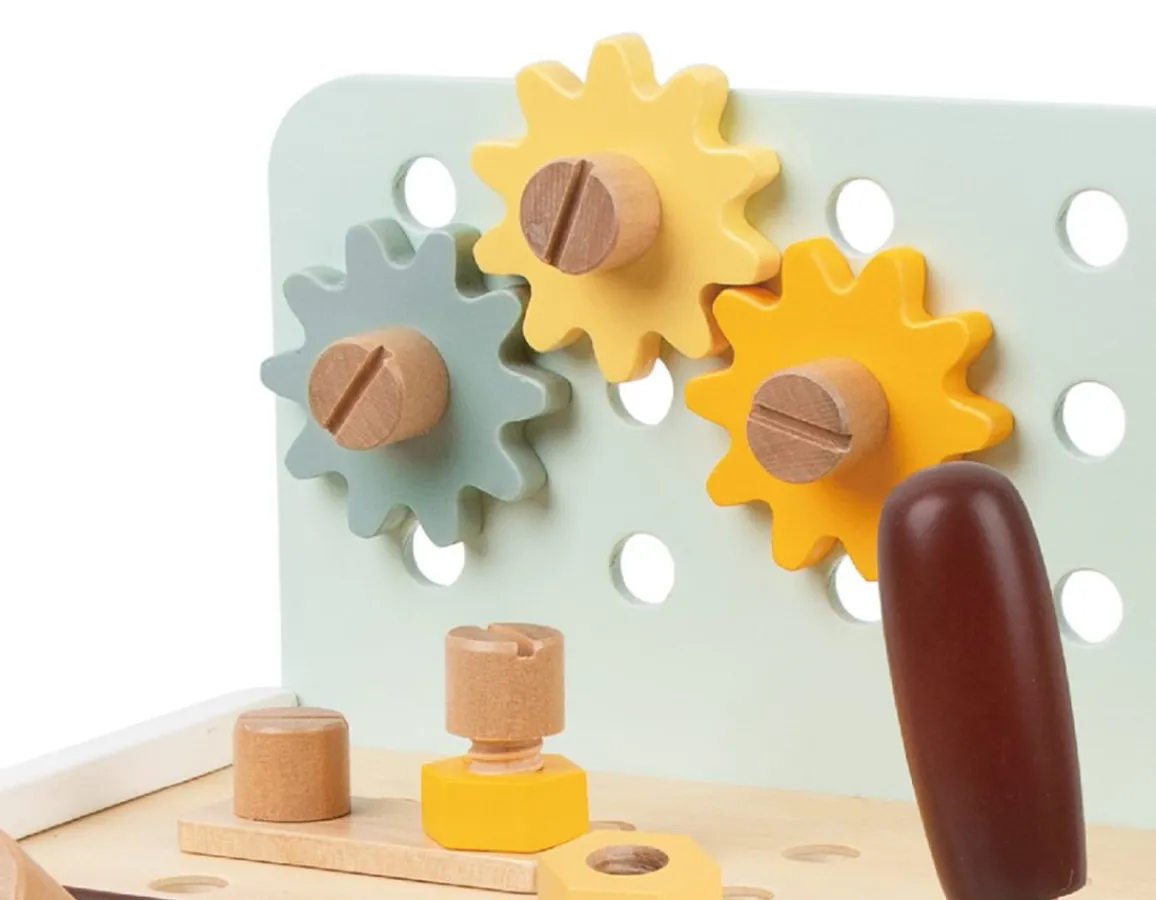 Standing 30cm tall, this brilliant tabletop work bench is a must-have for any little builder. Use the bolts and nuts to affix gears and struts to the surfaces, tightening with the screwdriver and wrench included. The set even includes a functional vice and handy chalkboard too. When play is over, all the pieces store neatly inside the unit. Made from sturdy natural wood, a wonderful addition to any playroom and great for dexterity skills. Nailed it!