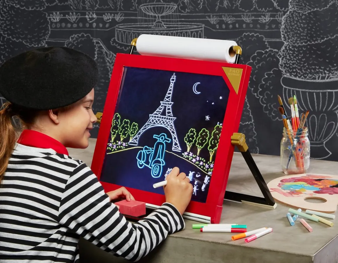 Encourage little artists with this brilliant art station from FAO Schwarz. Measuring 43cm wide, it allows you to create in three different ways – with a light-up LED screen, chalk blackboard and traditional paper too. Use six special markers to draw on the transparent surface, then watch as five funky light modes bring your masterpiece to life! Simply flip to access the chalk board, or unfurl paper from the 15m roll. Move over, Van Gogh!