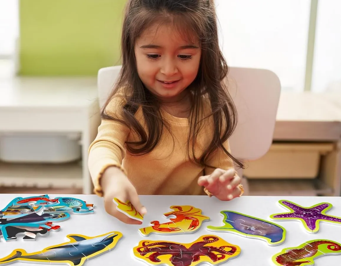 Build your child’s confidence and hand eye coordination with this selection of ten fun puzzles! Each guides children step by step to create fun ocean animal jigsaws, from a turtle and a dolphin to a seahorse! With a whopping 40 pieces total, start with the three piece puzzles and progressively move onto the four and five piece. Featuring a variety of sizes and colour coded to show the level of difficulty, making it perfect for everyone. Fin-tastic!