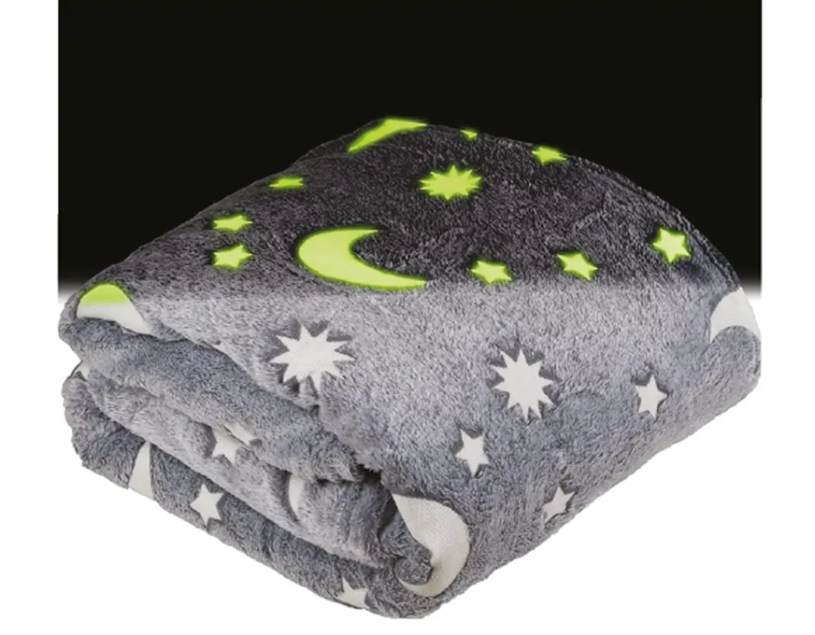 Add a touch of wonder to any bedroom with this fun and fascinating 100% polyester throw. Measuring 127cm by 150cm, the blanket is made of lovely grey fleece, fantastically soft and fluffy to the touch. The eye-catching pattern features bold stars and crescent moons that glow in the dark, just like magic! Perfect for bedtime or lounging on the sofa, this special glowing blanket is sure to bring comfort and joy to any little aspiring astronaut.