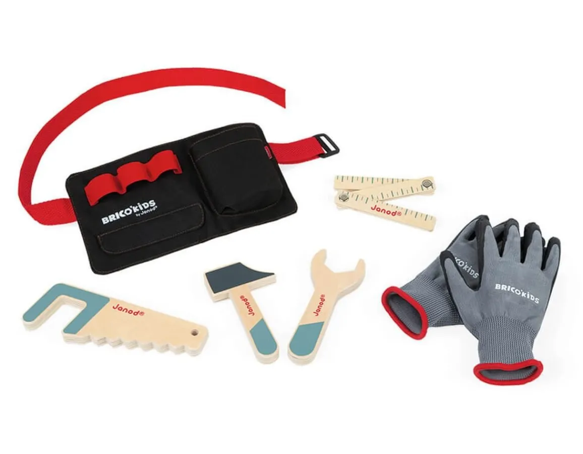 Wooden tools on a belt, with gloves – perfect for pretend play.