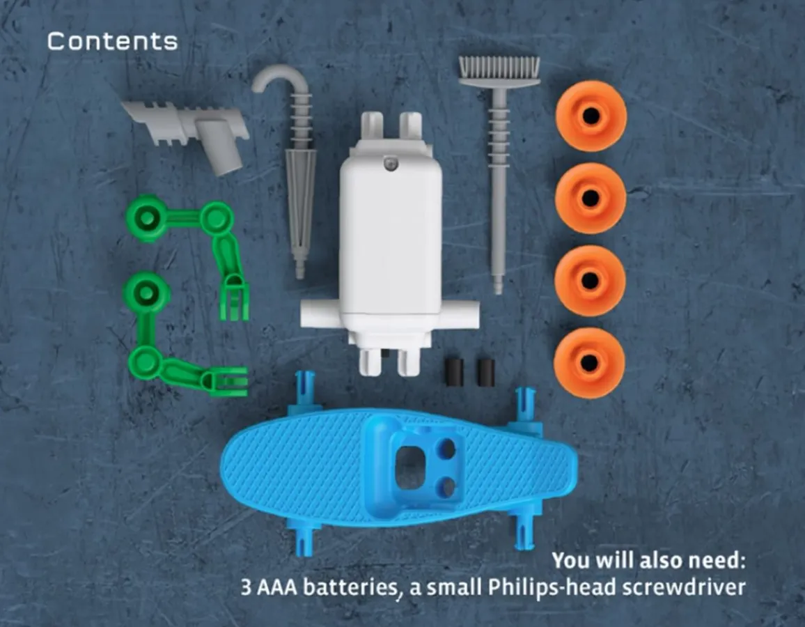 Clever 16-piece kit to create a cool robot that propels himself along.